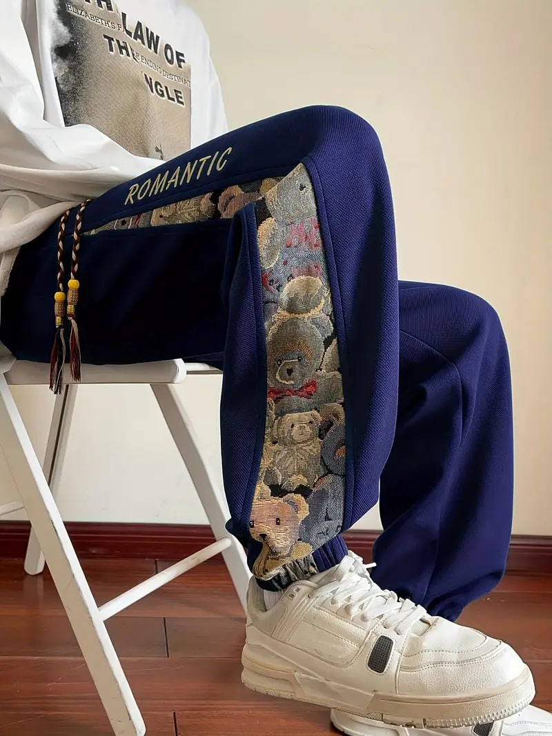Men's Loose Fit Bear Embroidery Joggers, Casual Stretch Street Style Sports Pants